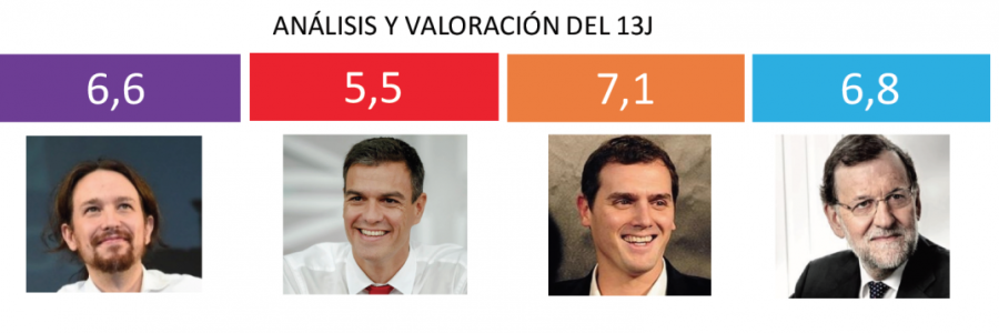 Sánchez estuvo neutro y comenzó también su declive, a la vez que Rivera aprovechaba la regeneración como el bloque estrella de sus intervenciones, mostrándose muy duro con el PP y la figura de Rajoy, que quedó bastante fuera de juego, pero también con Iglesias y la financiación de Podemos. Iglesias quedó tocado en este asunto y lo acusó desde entonces.